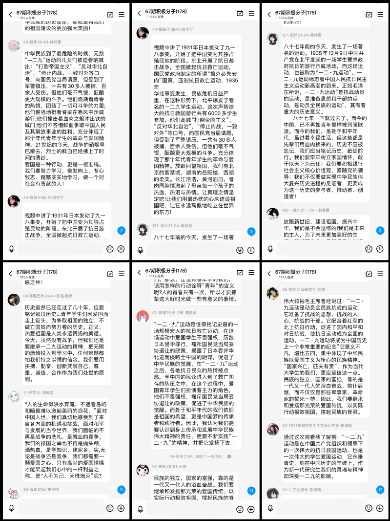 本次党日活动旨在深化爱国主义教育,通过观看《一二·九运动始末》和《大抗战》两部纪录片,引导学生铭记历史,继承和发扬爱国主义精神。观影过程中,大家全神贯注,回溯到八十七年前的抗日救国运动大潮中,追忆在中共领导下,北平青年以天下为己任,率先开展抗日救亡斗争的光辉历史,影片中情系华夏、为国献身、鞠躬尽瘁,死而后已的革命大无畏精神感染了每一位同学。观影结束后,各支部同学热情高涨进行了积极的交流,表示要学习革命先辈们的爱国热情,肩负起建设祖国的重任,用青春和热血捍卫祖国的美好未来。