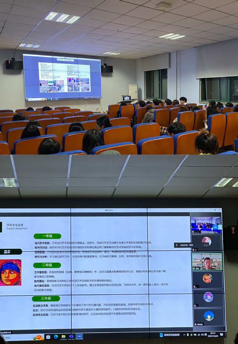 梁哲副教授在东四楼301开展题为“他山之石—英国创意艺术大学教学特点分析”的学术讲座,采用线上和线下同步进行的方式,全体研究生参与,反响热烈。