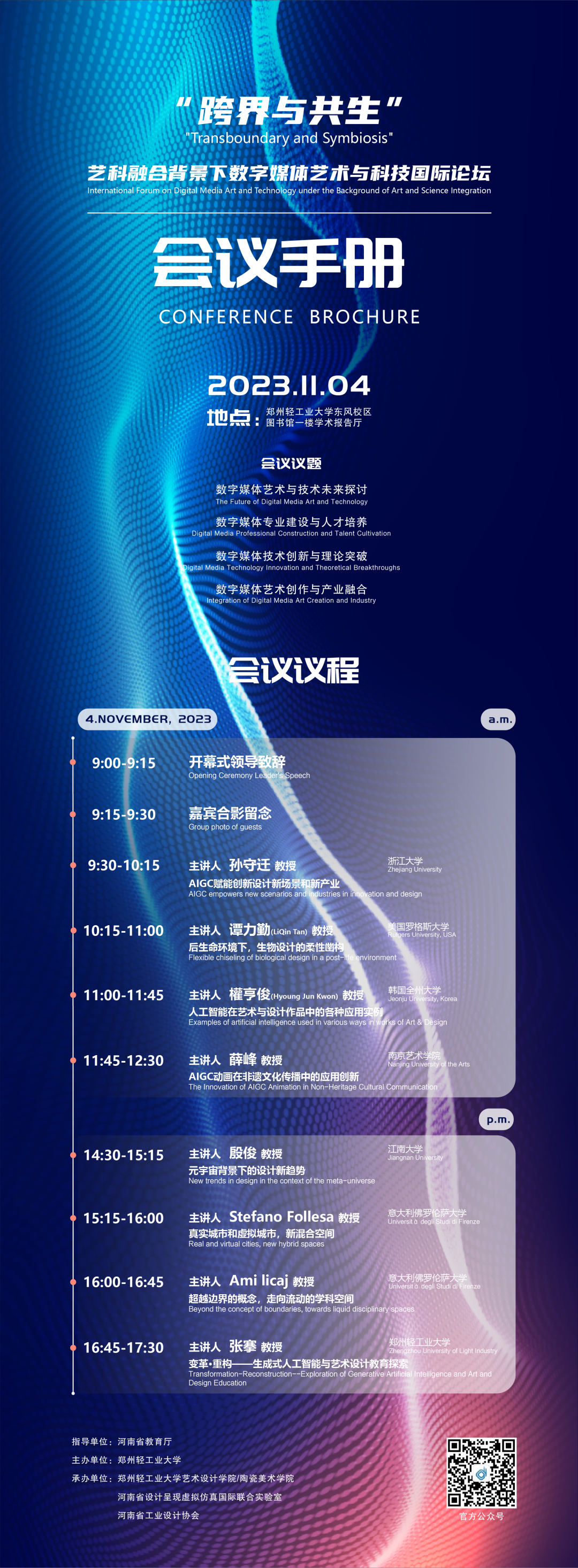 艺术与科学均是人类面对浩瀚宇宙生发出的纯粹认知欲和探索欲,持续驱动人类文明发展进程,创造性、想象力、系统性使二者共振融通。而在数字科技、信息革命、人工智能、中国制造2025等由此刻延伸至未来的宏阔变局中,审视设计学的“艺术+科技”交叉属性、思考设计人才素养模型,定位设计在“数字中国”战略布局的角色,是教育者和研究者的使命。经河南省教育厅批准,拟于2023年11月4日在郑州轻工业大学举办“跨界与共生”——艺科融合背景下数字媒体艺术与科技国际论坛,围绕未来数字化设计核心原理、人工智能艺科融合实践、文化数字化的商业模态等论题展开交流探讨,诚邀学界同仁拨冗莅临,为设计学未来发展贡献智慧方略。