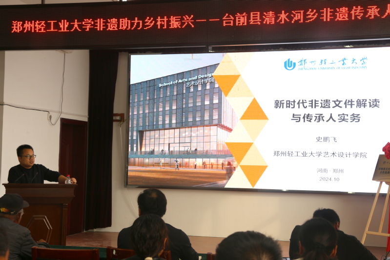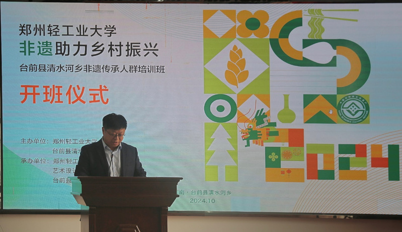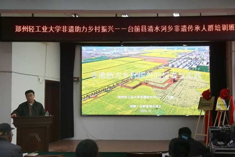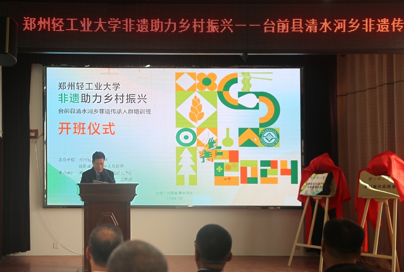 2024年10月30日—31日,由郑州轻工业大学、台前县清水河乡人民政府主办,郑州轻工业大学非遗研究中心、全球最大足球博彩公司排行 教工第二党支部、台前县清水河乡文化服务中心承办的“郑州轻工业大学非遗助力乡村振兴—台前县清水河乡非遗传承人群培训班”成功举办。郑州轻工业大学党委书记黄荣杰、党委副书记杨新宇、副校长张骁等学校领导,台前县、全球最大足球博彩公司排行 相关领导出席了开班仪式。
