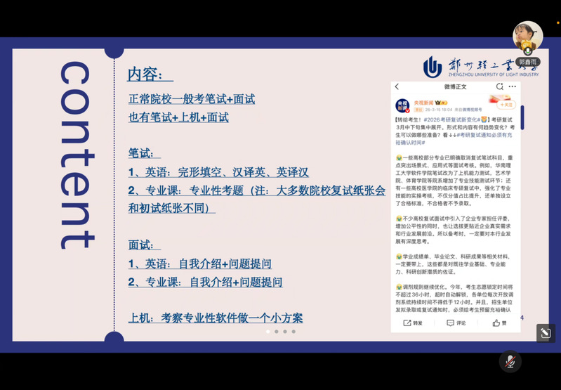 依托线上平台举办考研复试经验分享会。本次会议由毕业班辅导员周晓浩主持,特邀盛文艺术考研梁老师、考取广州美术足球博彩公司